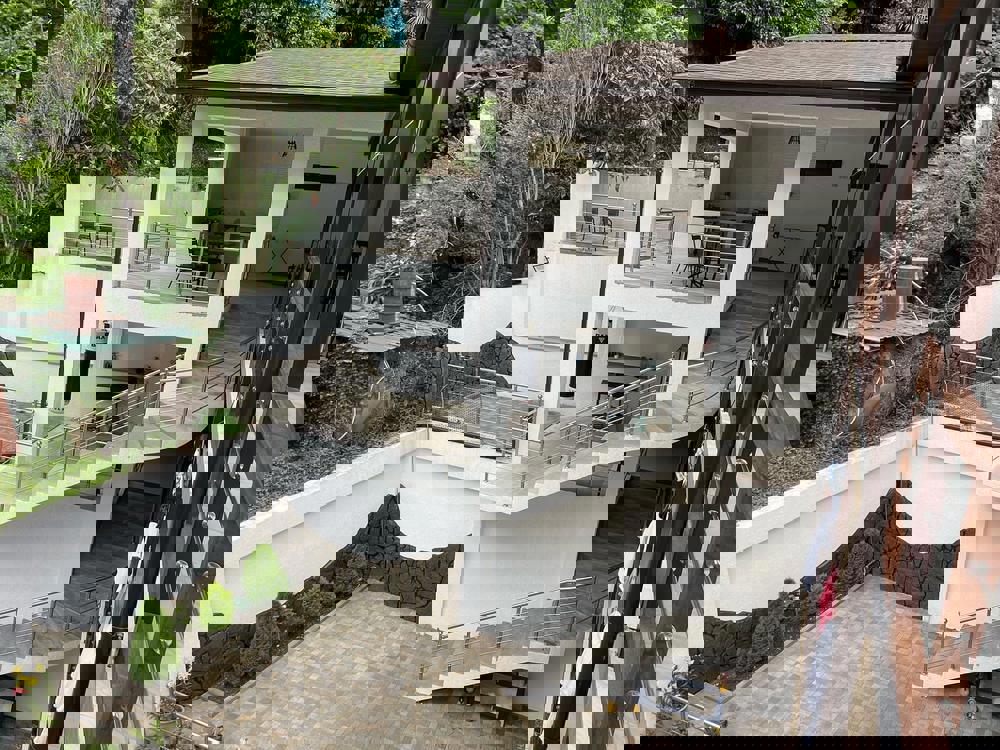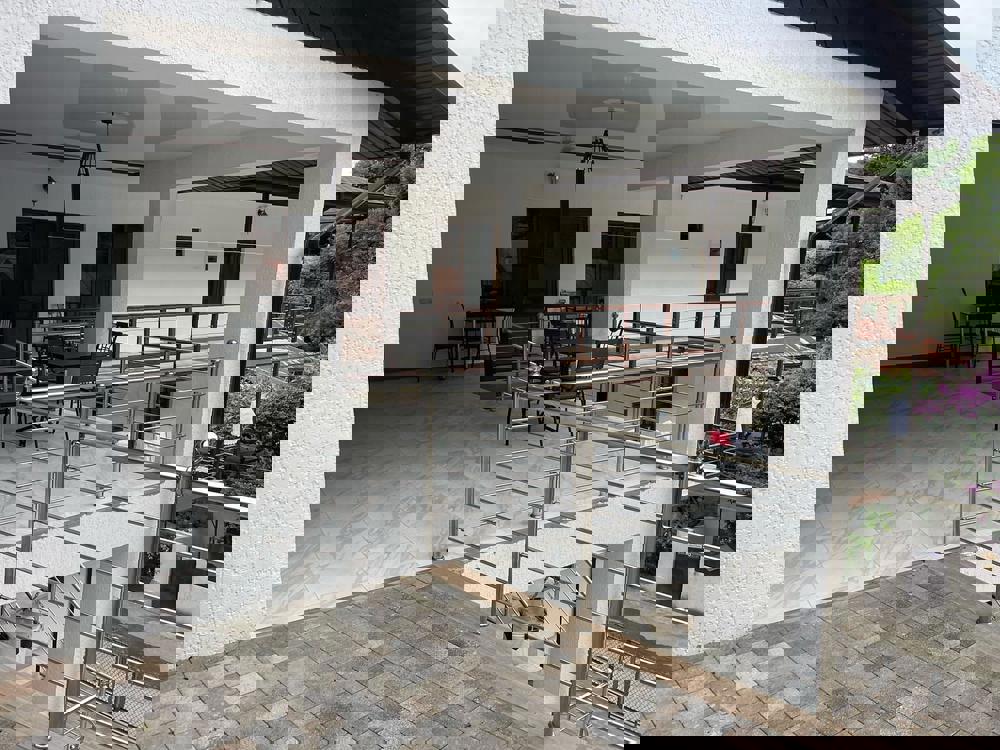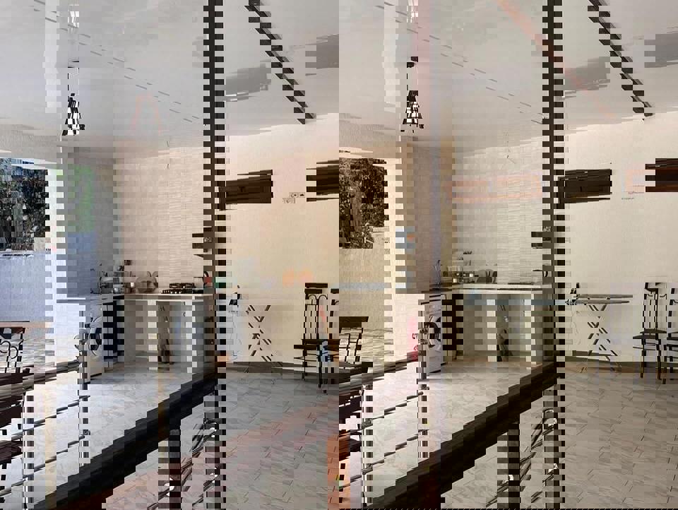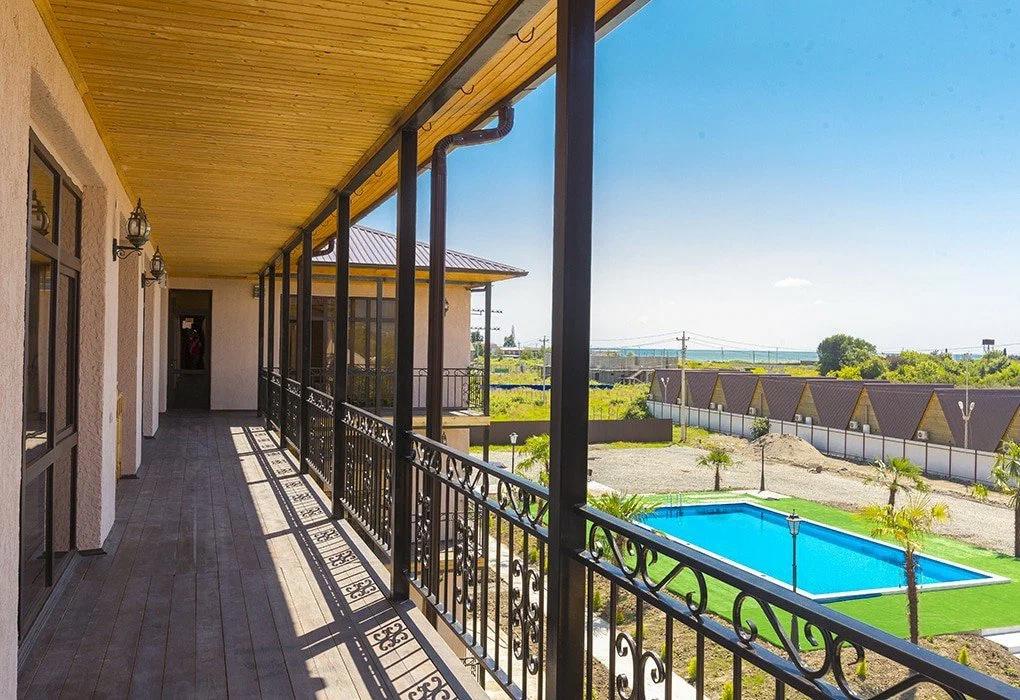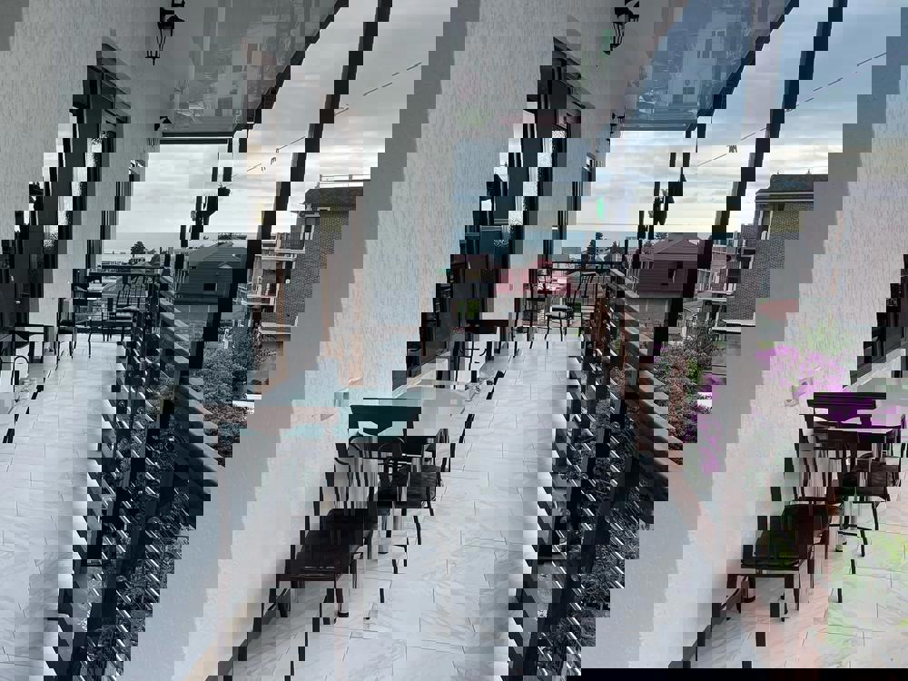 Компактная территория с большим общим балконом и террасой, где располагается летняя кухня столовая, оборудованная всем необходимым. На территории есть место с мангалом. С балкона открывается вид на город и море.