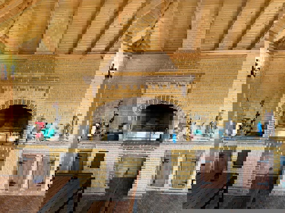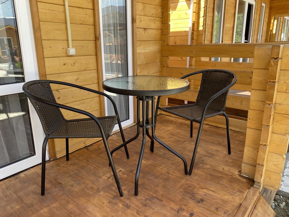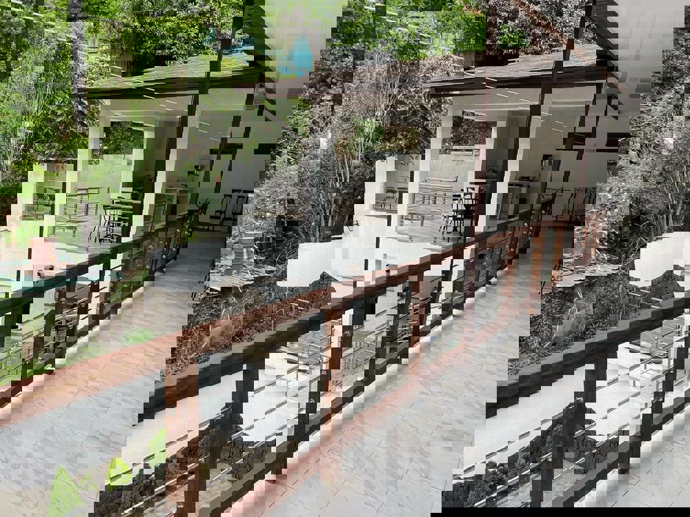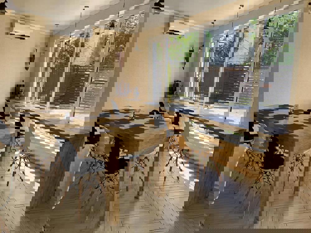 Компактная территория с большим общим балконом и террасой, где располагается летняя кухня столовая, оборудованная всем необходимым. На территории есть место с мангалом. С балкона открывается вид на город и море.