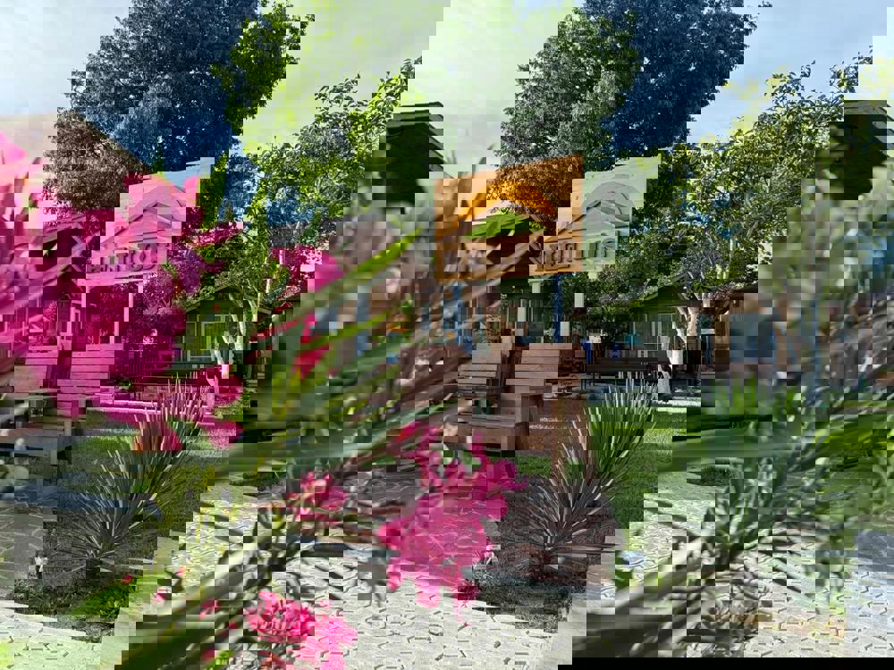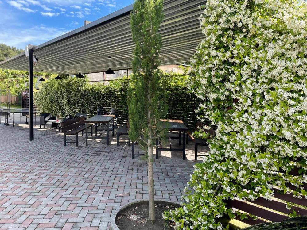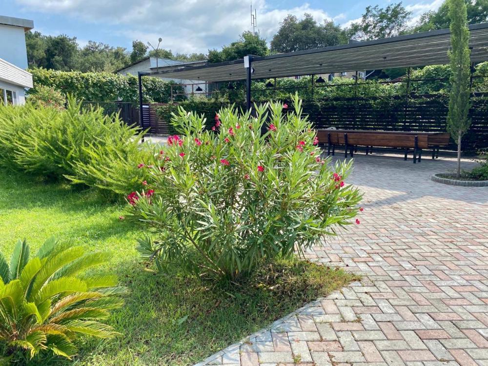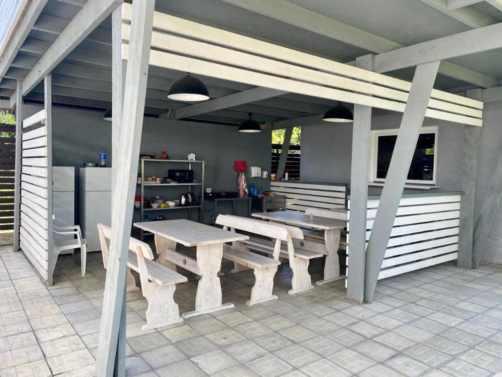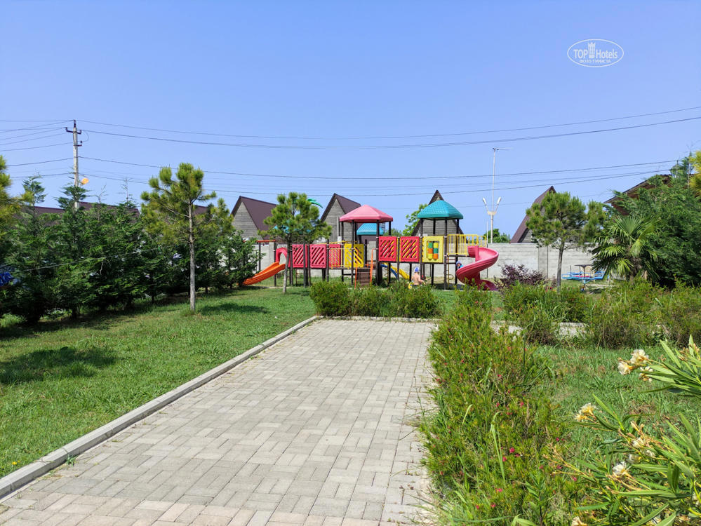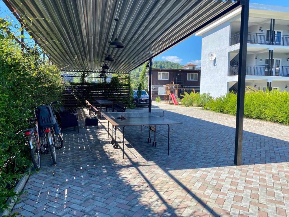 В отеле работает кафе, где готовят абхазские и европейские блюда. По утрам гостям подают завтраки. На территории оборудована зона барбекю, под навесом установлены большие столы и лавки. Стойка регистрации открыта круглосуточно. Постояльцы могут поиграть в настольный теннис. Имеется детская площадка. В любой точке доступно подключение к Wi-Fi.