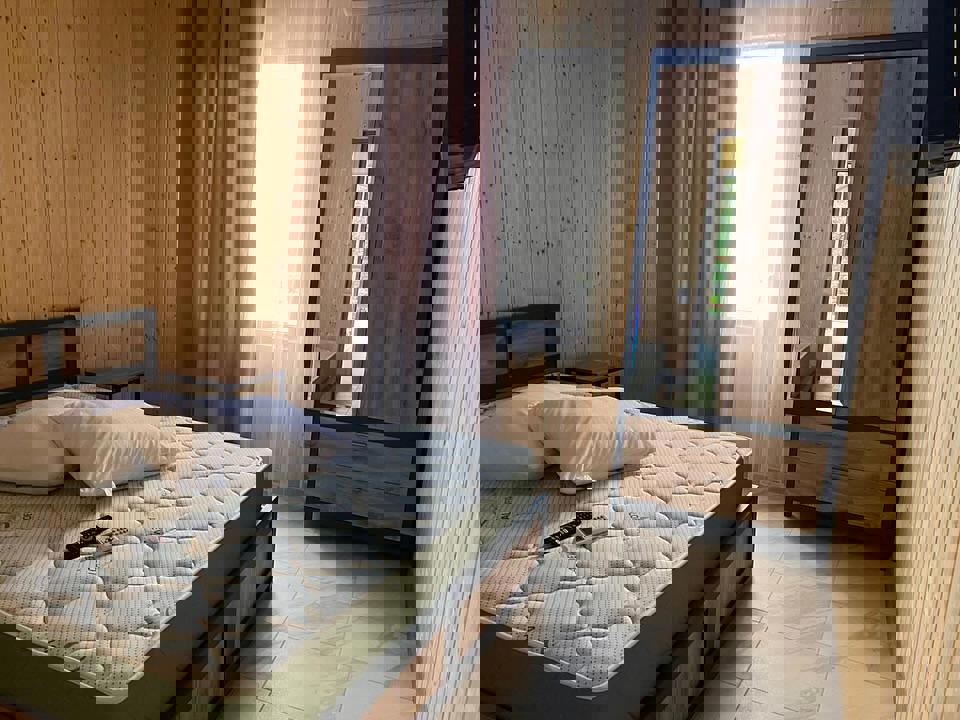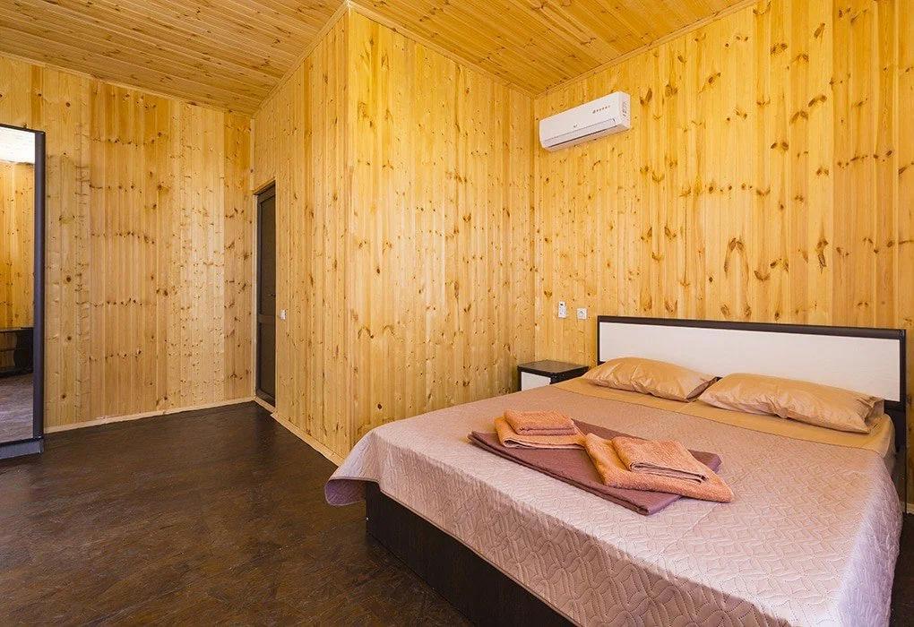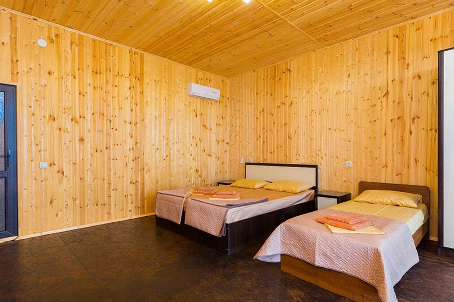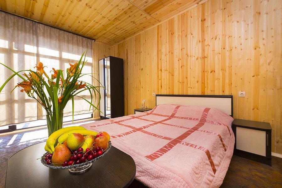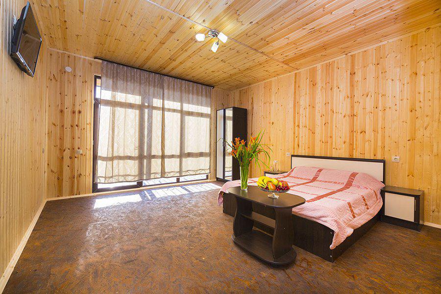 2-х местный стандарт: на первом этаже с оборудованной террасой( сушилка, стол, стулья), 1 комнатный домик, двуспальная+ односпальная кровати, шкаф, WI-FI, кондиционер ,ТВ,. санузел в номере. Косметические принадлежности: шампунь, гель для душа, зубная паста).Без питания (есть кухня+стиралка).