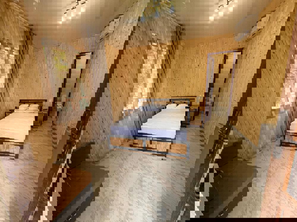 3-х местный стандарт: на первом этаже с террасой( сушилка, стол, стулья), 1 комнатный домик, двуспальная+ односпальная кровати, шкаф, WI-FI, кондиционер ,ТВ,. санузел. Косметика: шампунь, гель для душа, зубная паста).Без питания (есть кухня+стиралка).