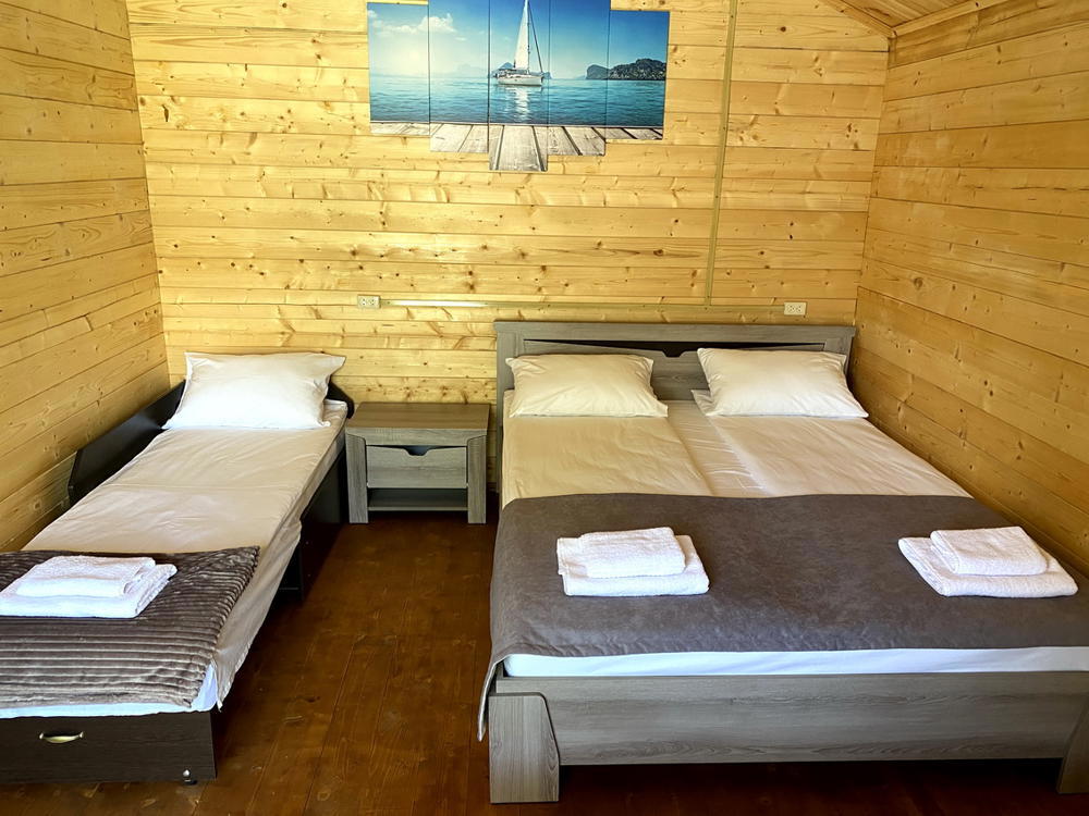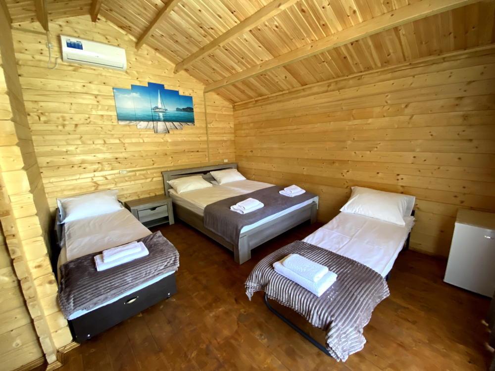 4-х местный стандарт (доп место): на первом этаже с террасой( сушилка, стол, стулья), 1 комнатный домик, двуспальная+ односпальная кровати, евро раскладушка, шкаф, WI-FI, кондиционер ,ТВ,. санузел. Косметика: шампунь, гель для душа, зубная паста).Без питания (есть кухня+стиралка)