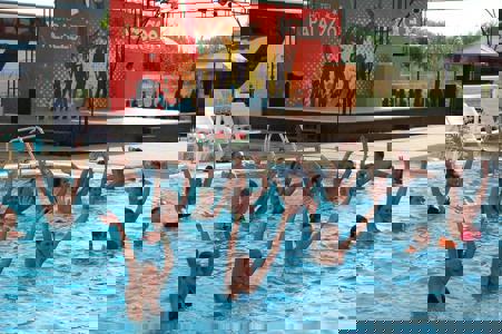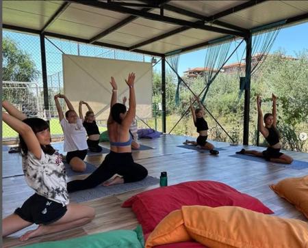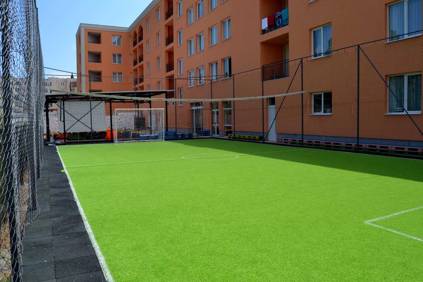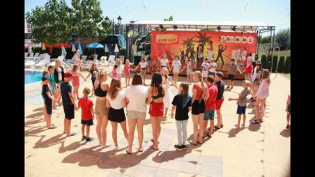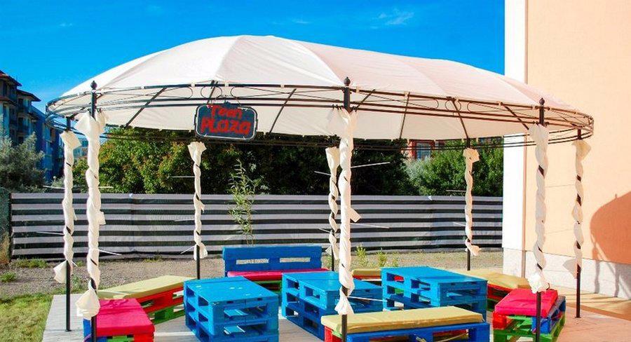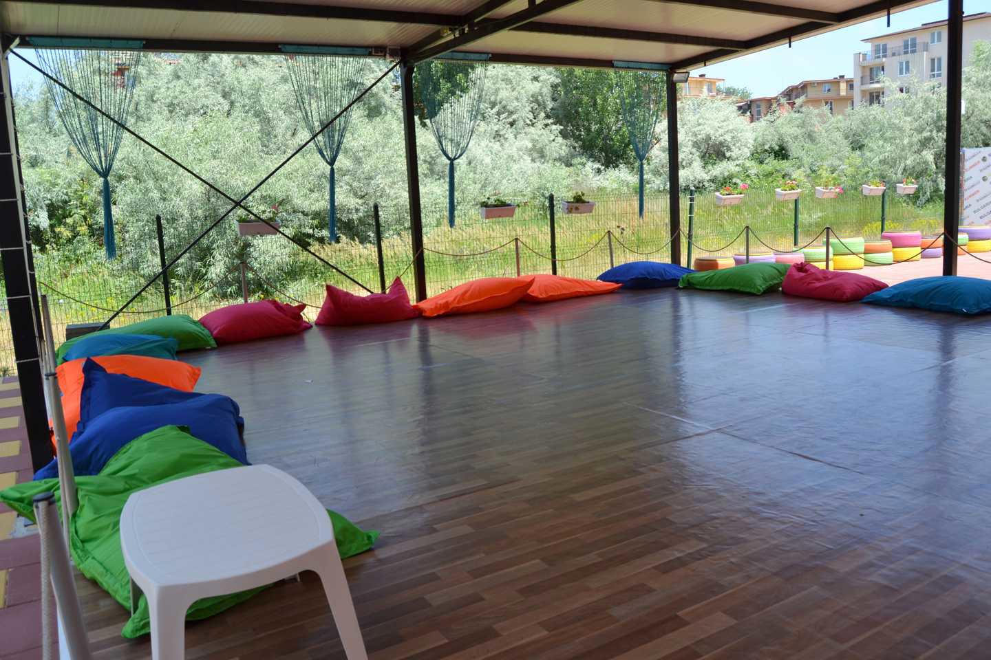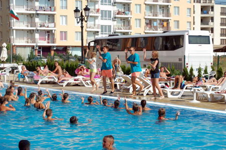 На территории отеля: сцена с профессиональным освещением 5мх9мх1м, включительно и диско освещение: лазер, дым-машина; зрительские места; полу-олимпийский бассейн ( 25 м х 12 м х1.50 м); шезлонги и зонты около бассейна; спортплощадка с противоударным покрытием (баскетбол, волейбол, мини-футбол), новый открытый танцевальный зал на подиуме 9х9 м (покрытие – ламинат). В 500 м от лагеря имеются 2 профессиональных футбольных тренировочных поля (дерн).