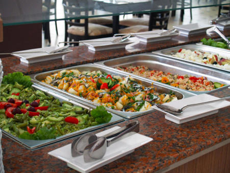Обед 12:00-14:00 - на шведском столе (2 вида салата, 3 вида холодных закусок и овощных нарезок, 1 суп/горячий или холодный; 3 мясных, куриных или рыбных блюда, 3 вегетарианских блюда, 2 гарнира, 1 вид десерта, 1 вид фруктов)