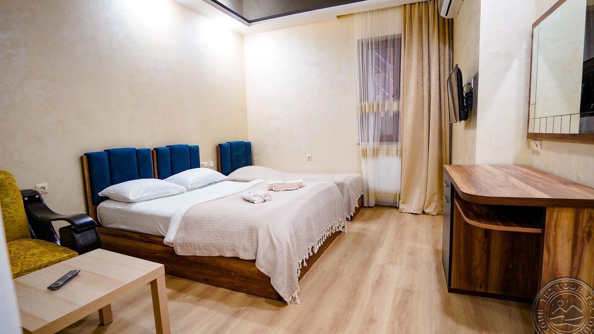 3-х местный номер: 2-х спальная кровать и диван (или кровать по запросу). Ванная комната, туалет, кондиционер, телевизор, холодильник, чайник.