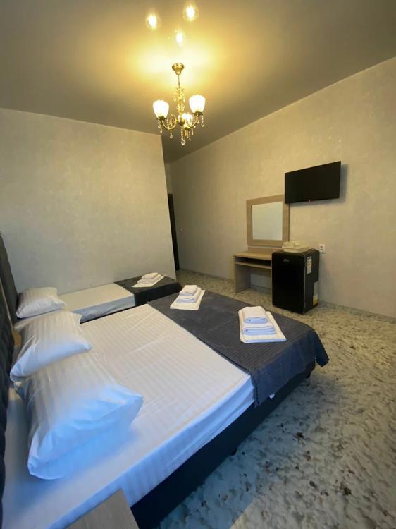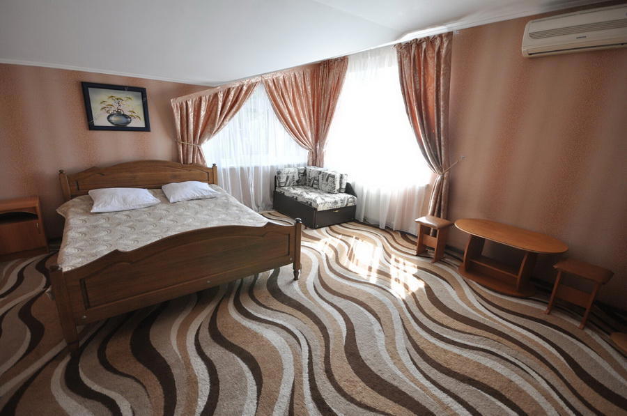 2-3-4х местные стандартные номера. В каждом номере есть двуспальная кровать, диван-кровать, кресло-кровать, шкаф, прикроватные тумбочки, журнальный столик, туалетный столик, вешалка, зеркало, санузел с душем в номере, кондиционер, холодильник, цифровое ТВ, интернет, Wi-Fi.